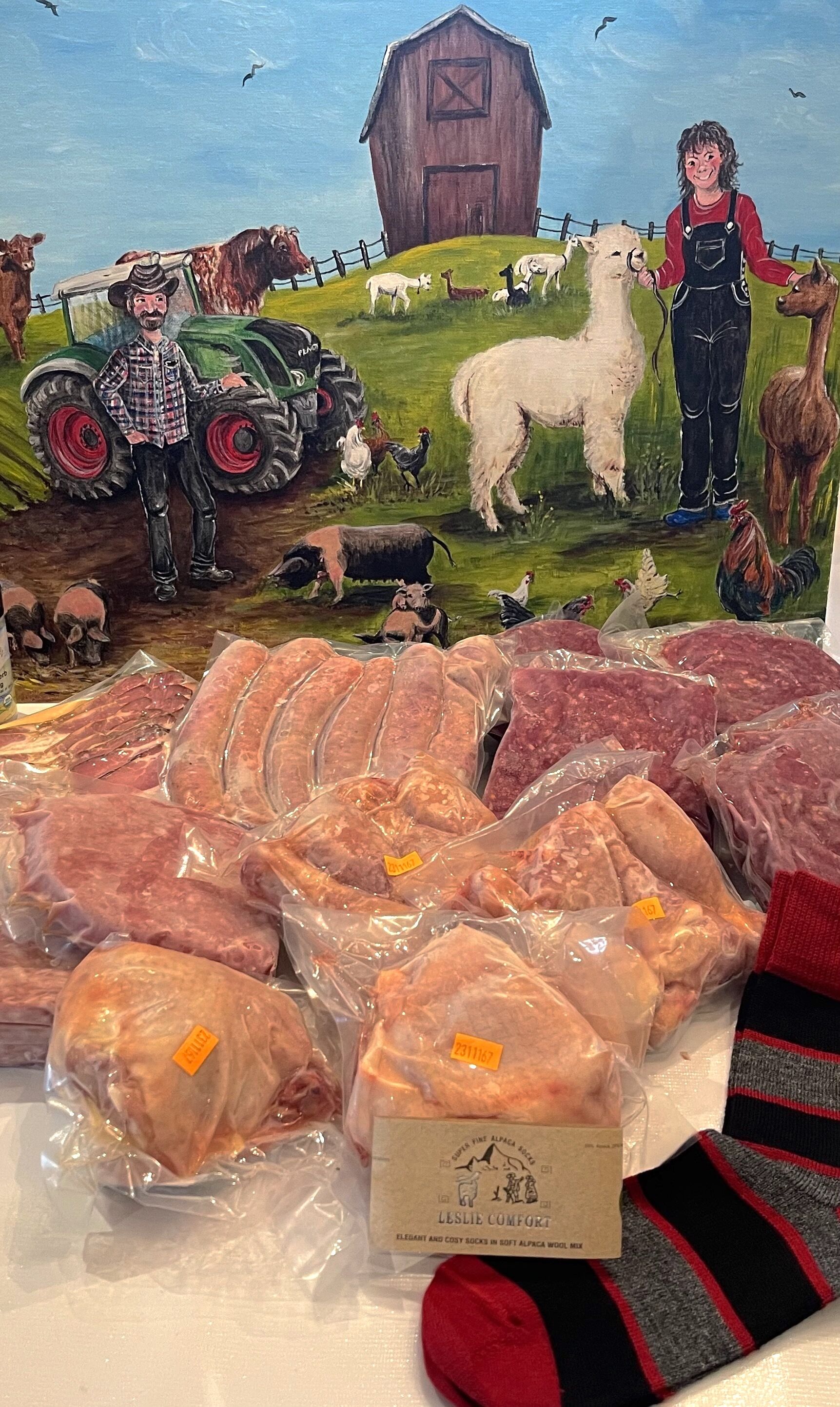 Our Small Meat Share is packed with real food and everyday value. This week’s bundle includes 4 lbs ground beef, ground pork, heritage pork sausage, double smoked nitrate-free bacon, Fenwood Farms drumsticks and thighs, plus a free pair of alpaca summer weight socks. Raised without antibiotics or hormones, with non-GMO livestock feed. Value $155, now $110 for members, $120 for non members. Great Deal!